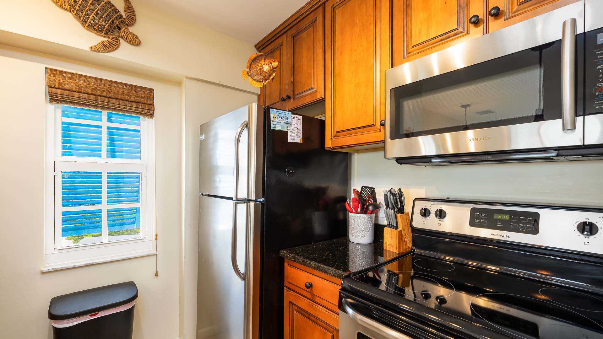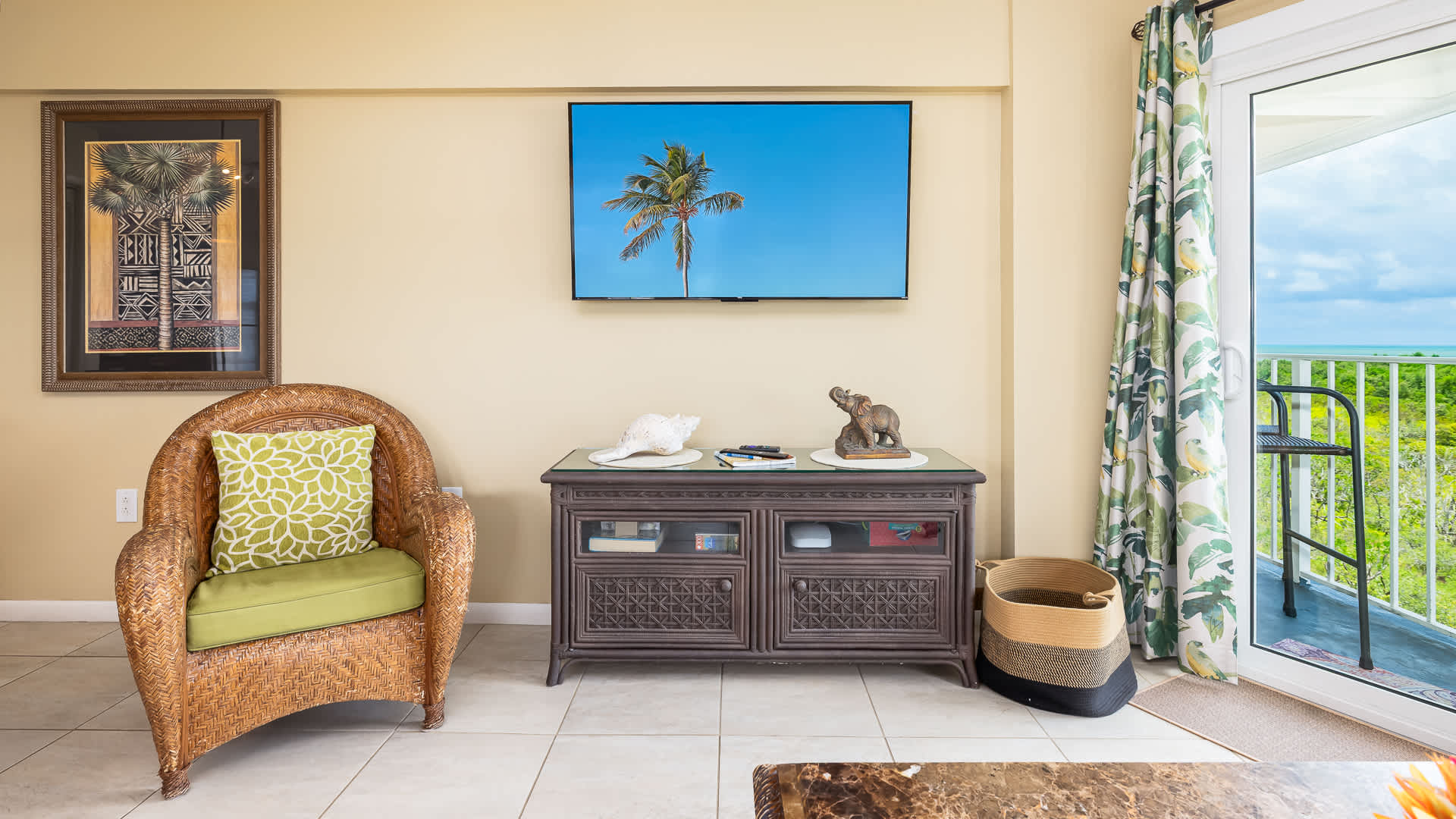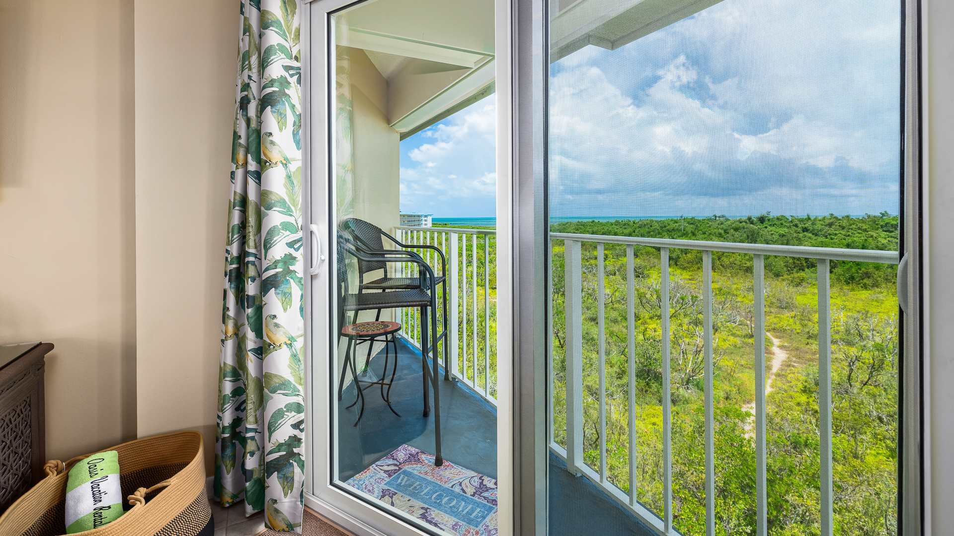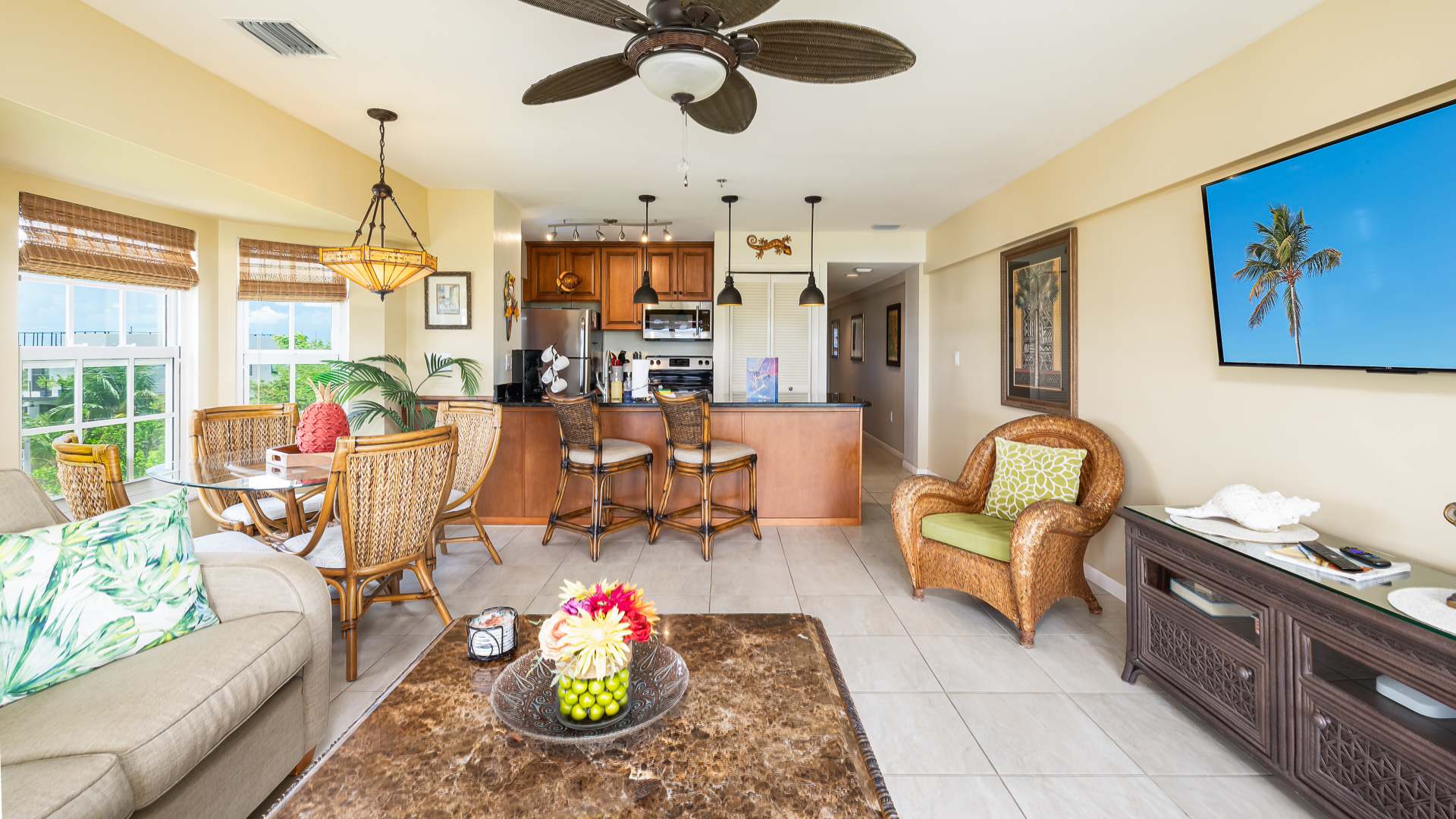 This condo is in the Marlin Suites Building at Ocean Pointe Suites at Key Largo. This captivating Resort offers so many exciting amenities for your family. Soak up the sunshine at the Junior Olympic pool with plenty of sun loungers. Or, if you prefer to go “native”, get your Vitamin D on the resort’s private sandy beach. Amenities galore at Ocean Pointe: Pool with newly re opened pool bar, hot tub, tennis & pickleball courts, marina, boat ramp, beach and fishing pier, 24/7 security guard and complimentary parking for up to 2 vehicles. The family grill master may enjoy taking their turn at one of the onsite grills, and then enjoy a barbecue at a family-style picnic tables. The little ones will enjoy the nearby playground. After dinner, take a stroll down the boardwalk to the marina and check out the catch of the day. If you’d like to bring your own boat up to 28’, dockage is available for an additional fee through the dockmaster reservation system. For nature lovers, our balcony has a view of our nature conservation area, complete with osprey nest. Bring binoculars to see some of the Keys Our 24-hour Security and on- site rental management will give you peace of mind, and attend to any needs you may have. Newly Refreshed and Upgraded Accommodations Your condo has been recently completely renovated with custom designer decor, top of the line finishes, and local artwork all in the vibrant, tropical colors of the Keys. The spacious living room offers an airy open floor plan and easy access to the balcony, boasting views of both the crystalline ocean and the ancient mangroves. The osprey nest is a special treat! Furnished with a custom queen sleep sofa with topper, the living room provides an HDTV with cable and free WiFi, plus games and books, for your entertainment. The cozy dining nook accommodates four and is smartly situated to take full advantage of the stunning views. Whether you are working or on vacation, this is a pretty spot to be!